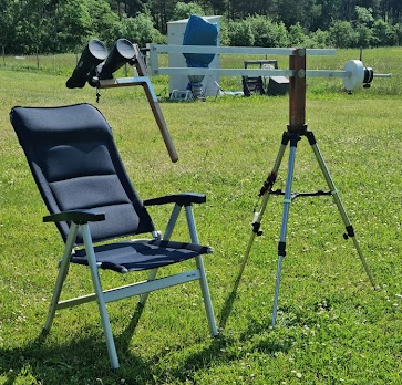 Veckans tankevurpa: Hur många gånger har jag inte balanserat teleskop så att de ska gå att hantera och motorer inte ska överbelastas? Det vore kanske inte för mycket begärt att det någon gång skulle falla mig in att göra samma sak med kikare??? Idiot! Det är inte SÅ konstigt att min kikarställning varit oregerlig som en katt i koppel. Om man bara vänder på vinkeln som håller fast kikaren så uppnås nästan perfekt balans på den stora kikaren.